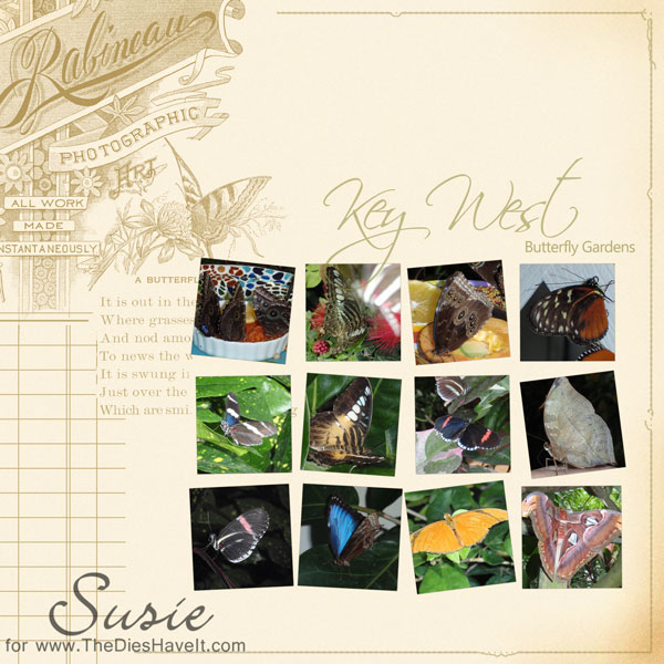 Susie Cannon Moore has combined several of the vintage patterns in gold to create a fantastic border for her page. These patterns frame her photos nicely and add to the "gardenesque" theme of Susie's page as well.
